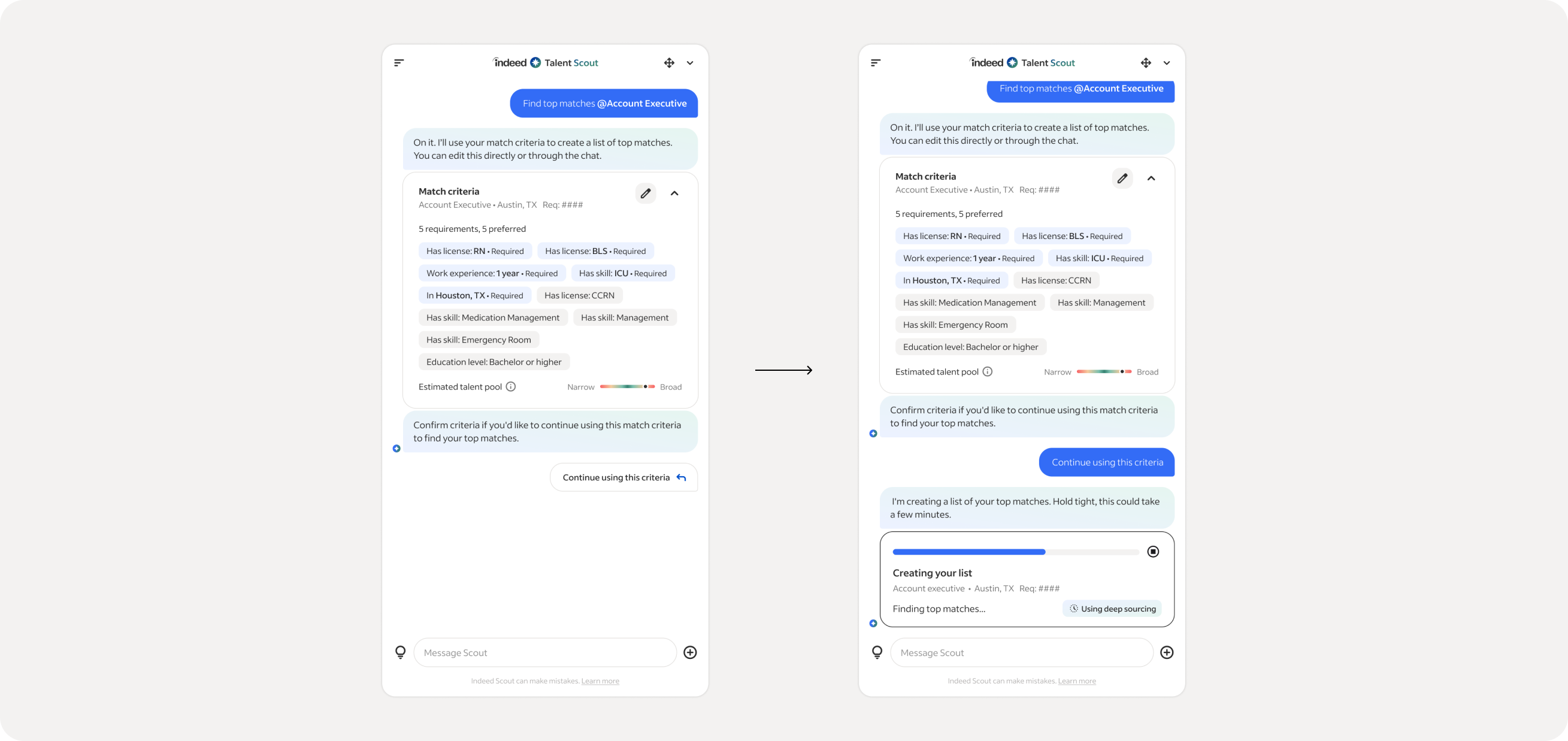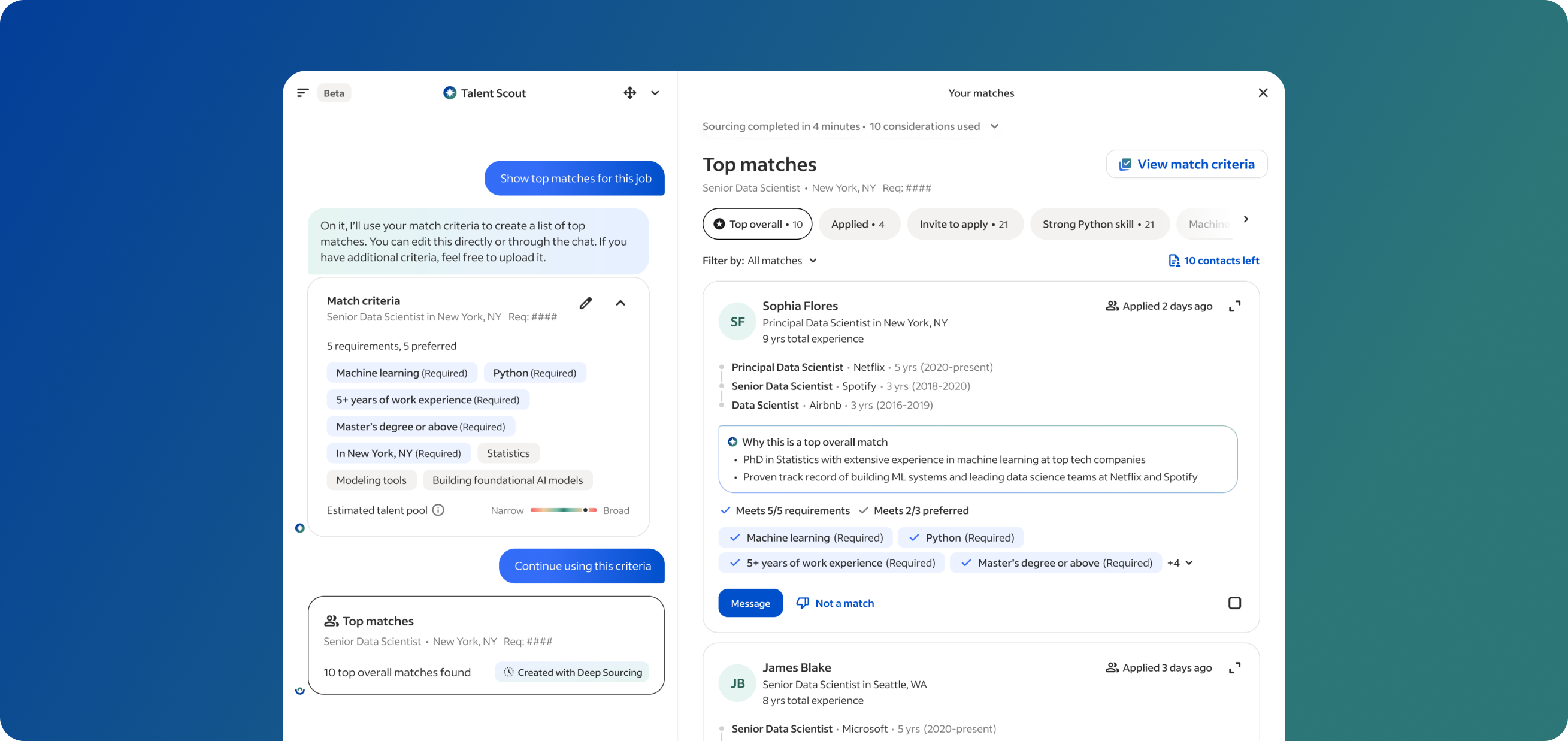 We became Deep Sourcing as Talent Scout's AI-powered matching experience. It searches entire talent pools simultaneously, ranks results, and explains why each candidate fits — delivering both speed and confidence.